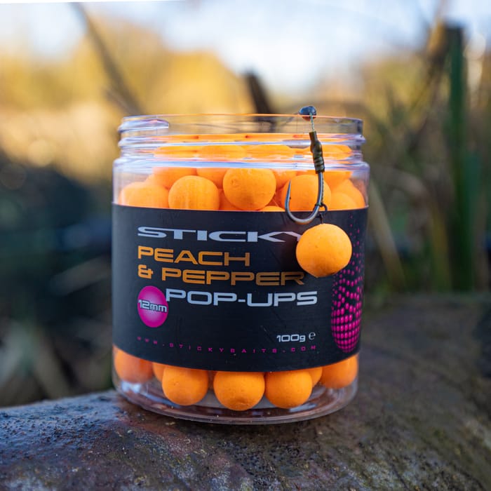 The bright orange pop ups are Peach & Pepper flavoured which offers an old-school classic combination of Peach Melba flavour and pure Black Pepper Essential Oil. Peach and Pepper hookbaits really have a knack of singling out the bigger fish.